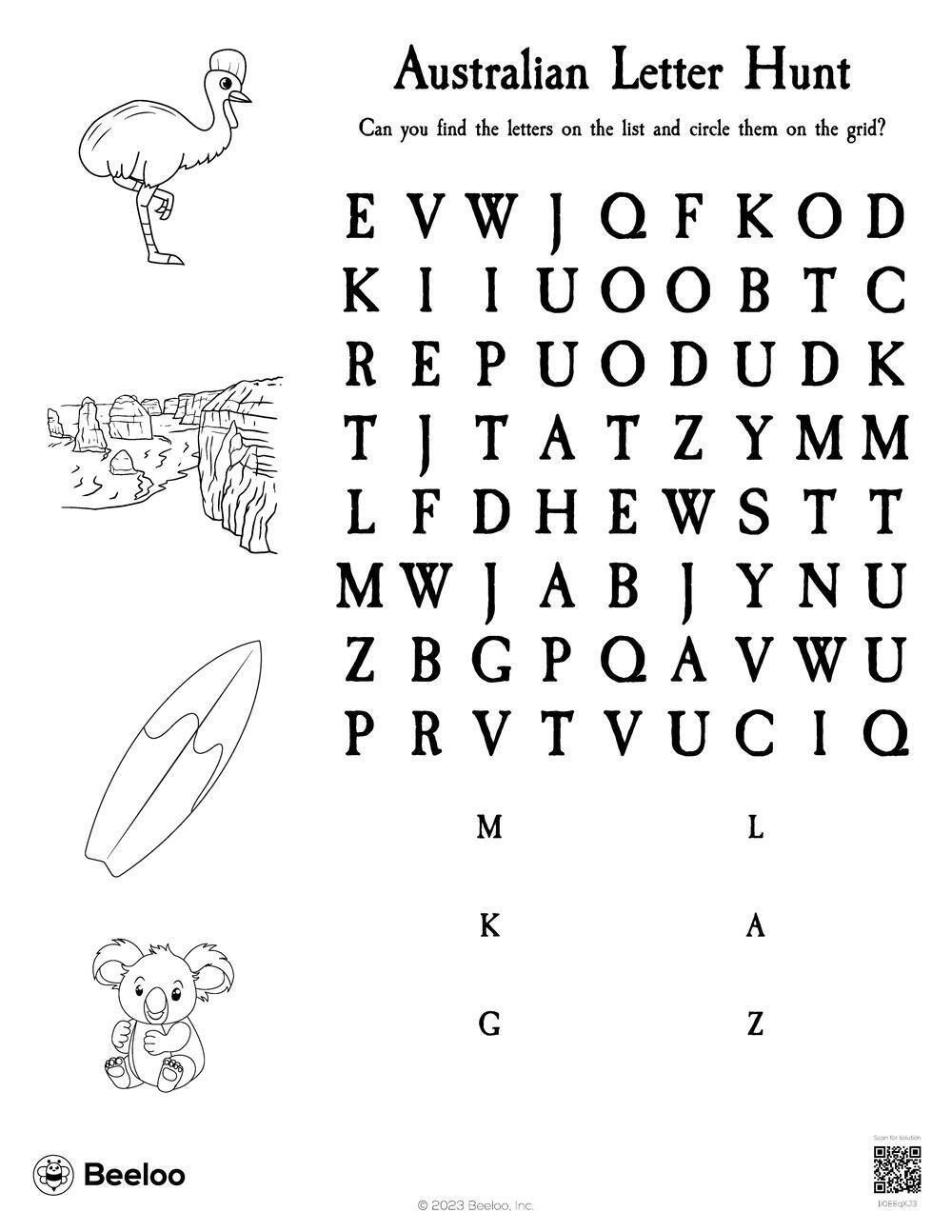 With words related to Australian animals, landmarks, and culture, this word search is perfect for all ages. Simply print out the sheet, grab a pencil, and start searching for words like kangaroo, Sydney Opera House, and boomerang.