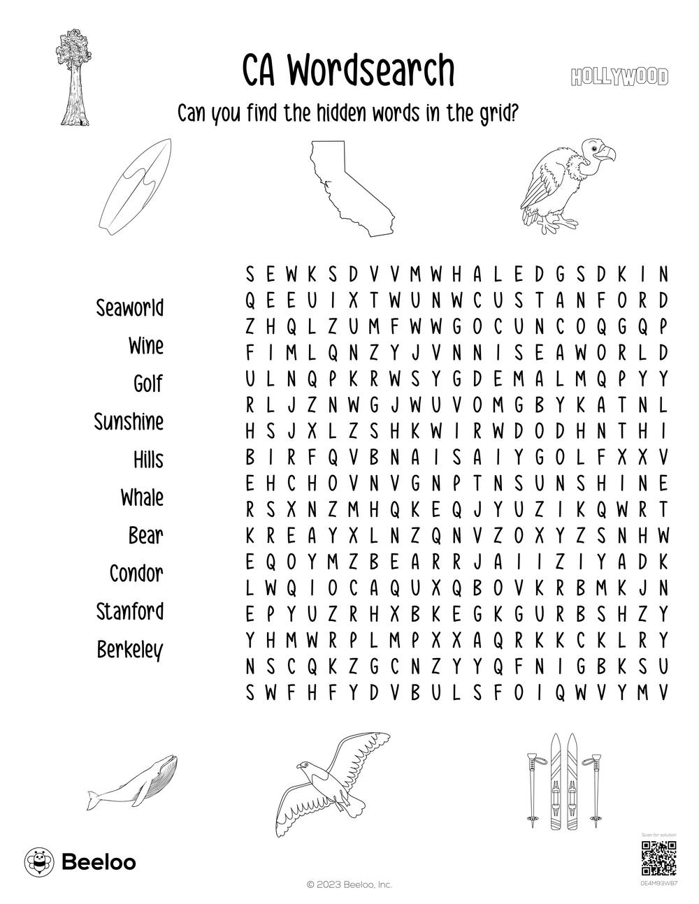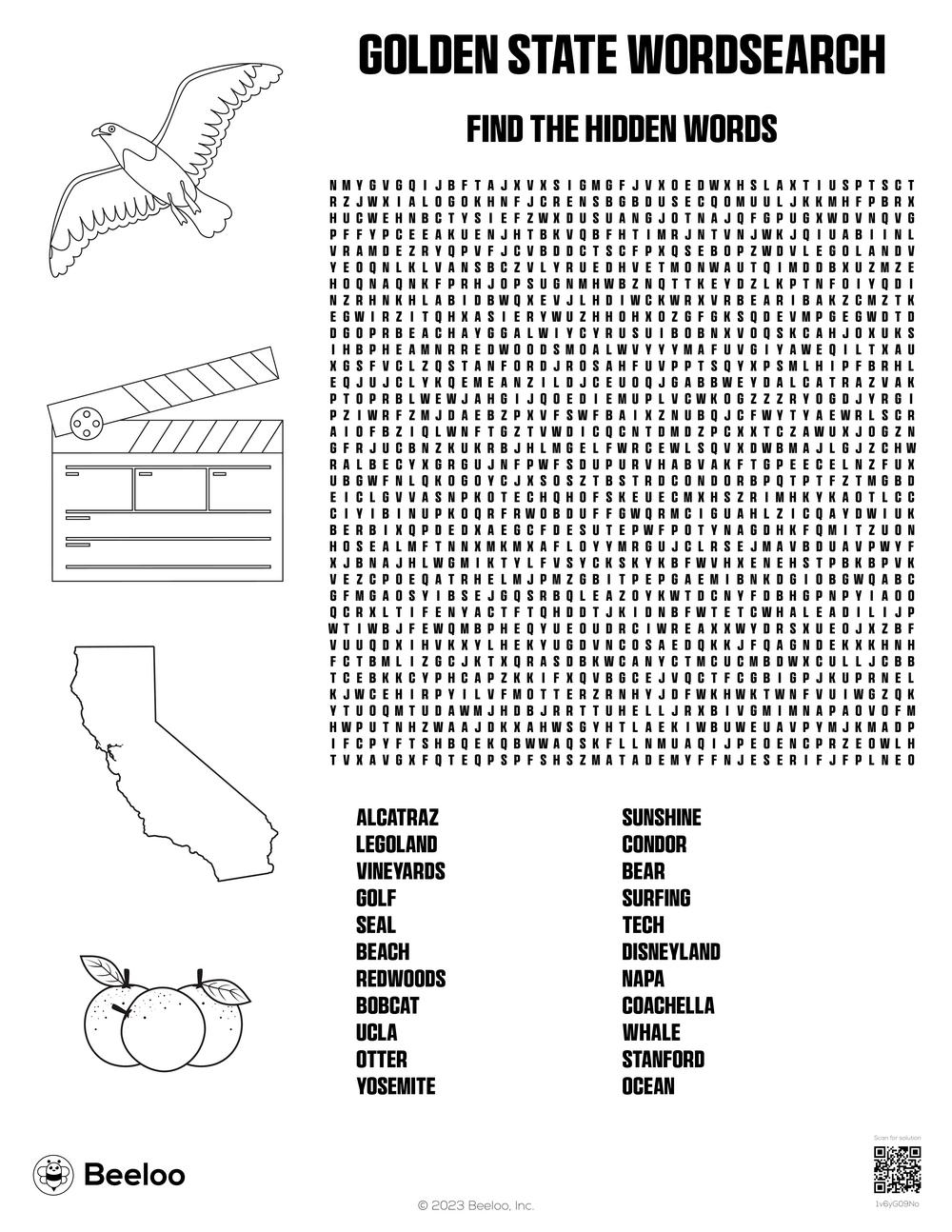 This word search features popular California landmarks, cities, and symbols. Your kids will have a blast searching for words like Hollywood, San Francisco, Golden Gate Bridge, and more. It’s a great way to introduce them to the beauty and diversity of the state.