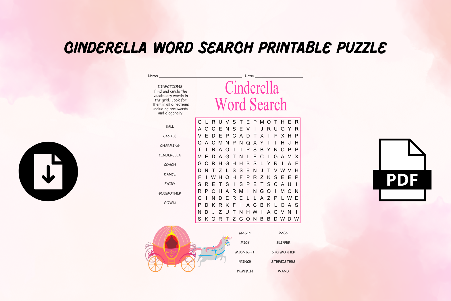 The Cinderella Word Search Printable features a list of words related to the classic story, such as “glass slipper,” “fairy godmother,” and “prince charming.” Kids will have a blast searching for these words while reminiscing about their favorite parts of the tale.