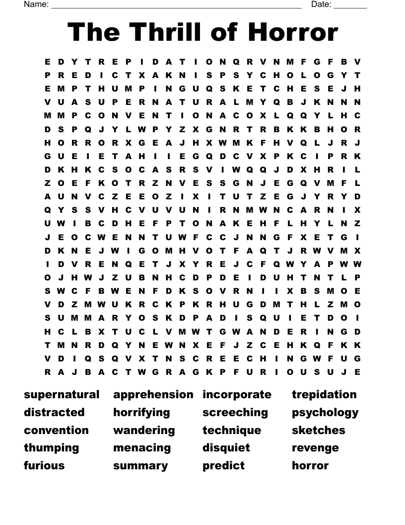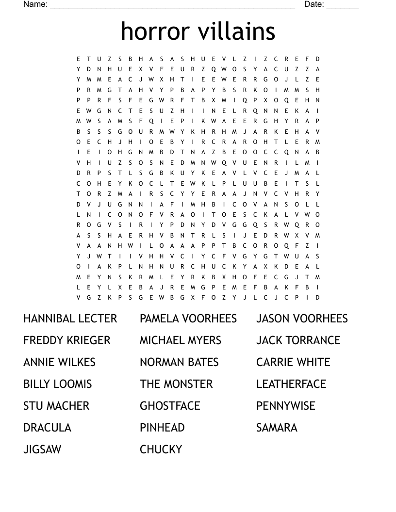 Get ready to dive into the world of horror with this exciting word search. Challenge yourself and your friends to see who can find all the hidden words first. Download your Horror Word Search Printable now and enjoy hours of creepy entertainment!