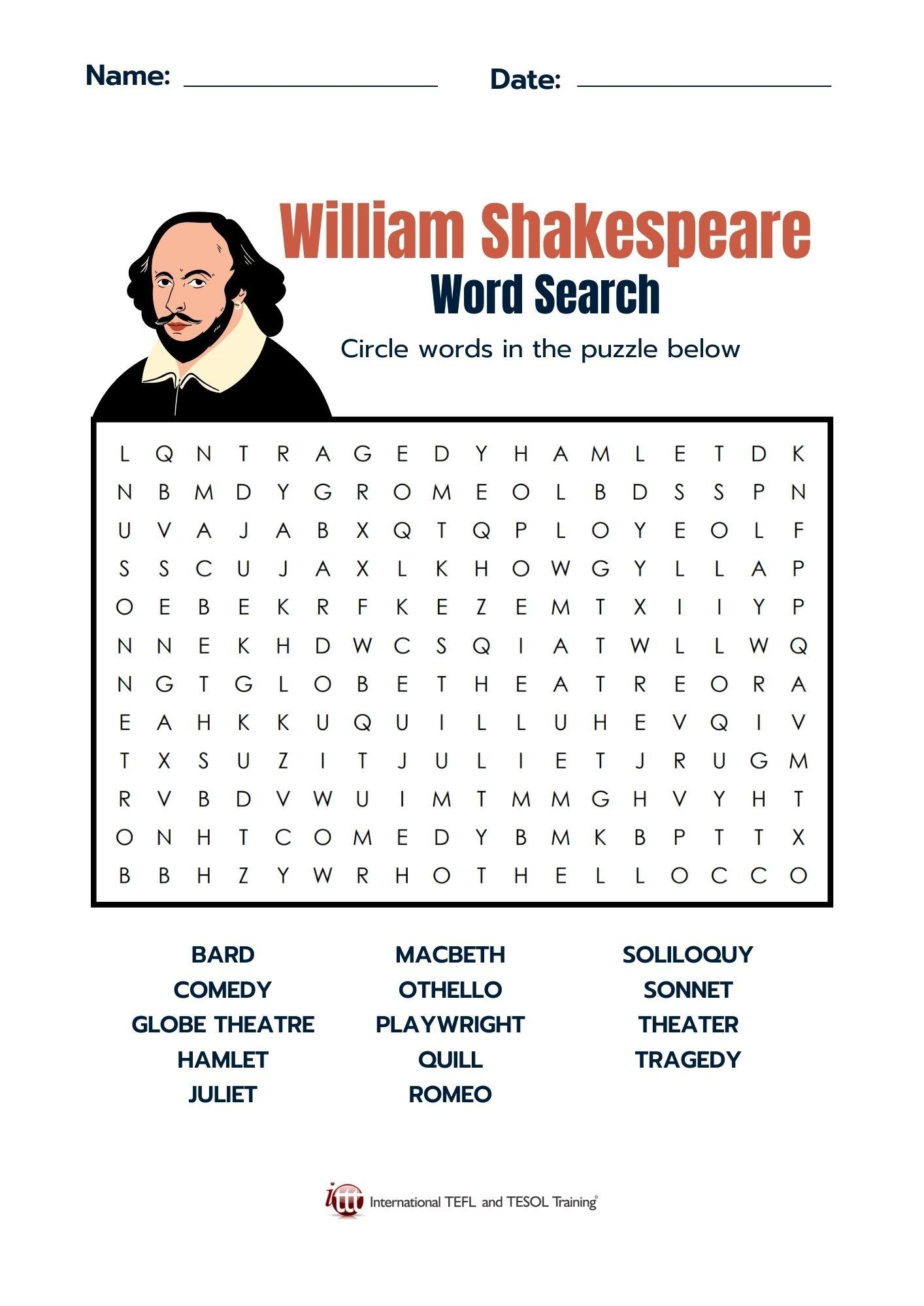 Whether you’re a student studying Shakespeare in school or just a fan of his plays and poetry, this word search is a great way to have some fun while also brushing up on your Shakespearean vocabulary. You can work on it alone or with friends and see who can find all the words first!